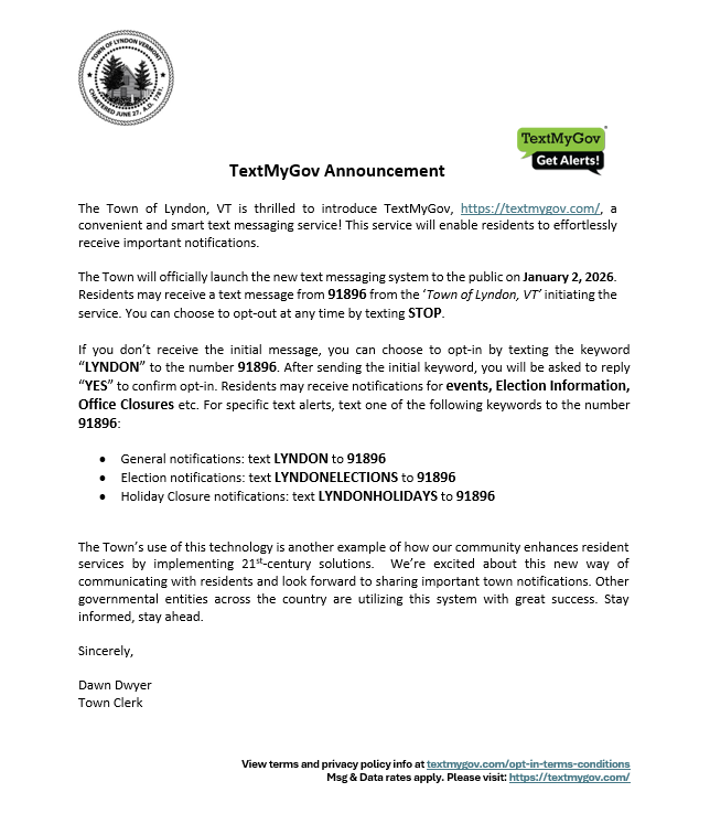 You can get Text Notifications directly from the Town of Lyndon, VT.